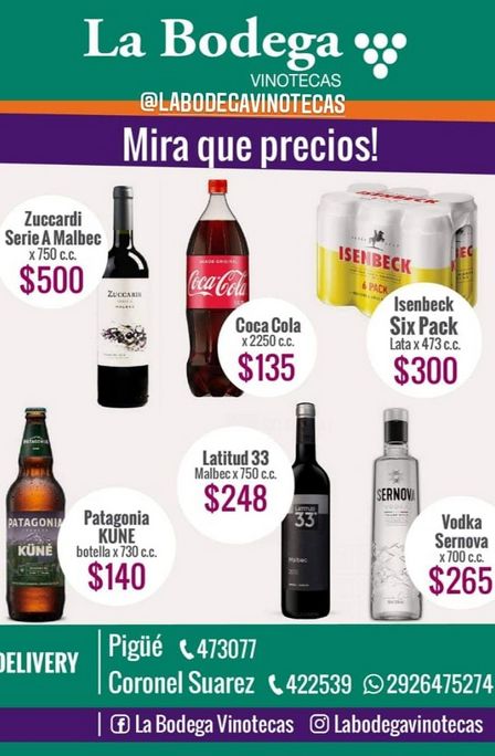La Bodega cuenta con el pack de seis cervezas Isenbeck de 473 cc a 300 pesos, la Coca Cola cuesta 135 pesos los 2.250 cc, y el Zuccardi Serie A Malbec está a 500.