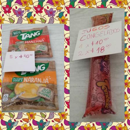 Dos jugos Tang pueden hallarse por 40 pesos, un jugo congelado sale 10 pesos y 2 jugos congelados están en 20 pesos.