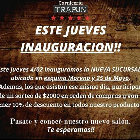 Carnicería Trapun cuenta el jueves, por la mañana, tendrá la rebaja del 10 por ciento en las compras de todos sus productos.
