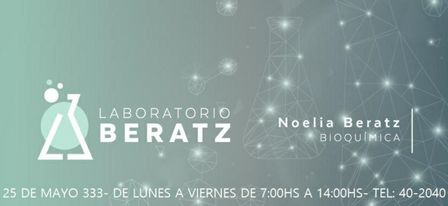 El Laboratorio Beratz está a cargo de la Bioquímica Noelia Beratz en 25 de Mayo 33 de la ciudad recibiendo consultas al 011-15 68 22 97 01 y al 02923 40 20 40.