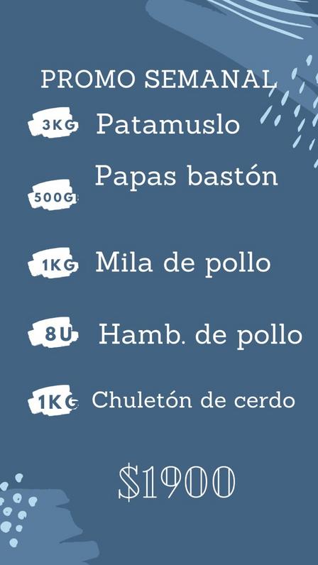 Granja Pigüé, por 1.900 pesos, en contado efectivo, tiene 1 kilo de chuletón de cerdo, 8 unidades de hamburguesas de pollo, 1 kilo de milanesas de pollo, 500 gramos de papas bastón, y tres kilos de pata muslo de pollo.