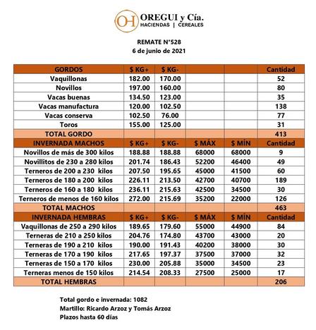 Oregui y Cía. dio a conocer los valores de su remate número 528