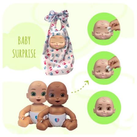 Baby Surprise viene envuelto en un pañal con los ojos cerrados, con un chupete, una manta y un pañal de tela, siendo recomendado a partir de los 3 años.
