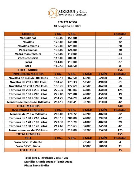 Oregui y Cía. dio a conocer los valores promedio de su remate