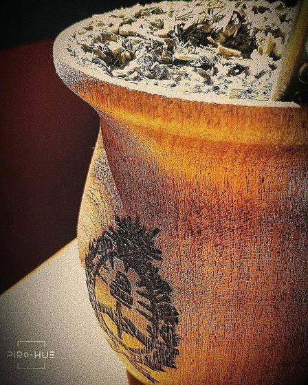 Piro Hué efectúa trabajos en mates, tablas, yerberas, y cartelería sobre madera.
