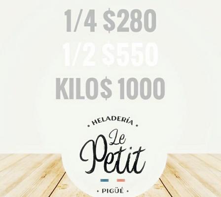 Le Petit recibe pedidos al 2923 69 37 65 contando con el kilo de helado a 1.000 pesos, el medio kilo a 550 pesos, y el cuarto de kilo a 280 pesos.