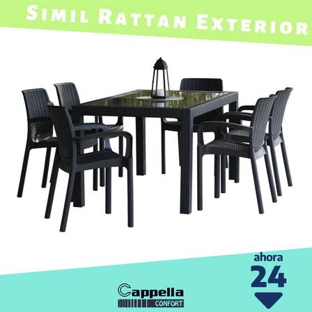 La Mesa Indonesia, con vidrio, de 150 por 90 cm, junto a los seis sillones Guinea, de color negro o blanco, pueden hallarse en el local.