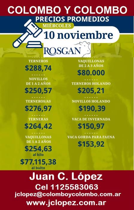 Según la consignataria de hacienda el Rosgan de ayer "mostró nuevamente una gran firmeza, con muy buenos precios y subas del 8 % al 10 % en todas las categorías de invernada", anunciando el próximo remate para el día 15 de diciembre.