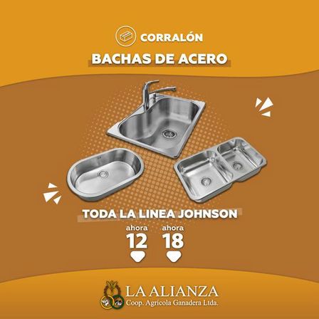 Toda la gama de bachas de acero de la marca Johnson puede ser hallada en la Sección Corralón ubicada en calle Ruperto Tanco esquina Diagonal Misiones de Pigüé.