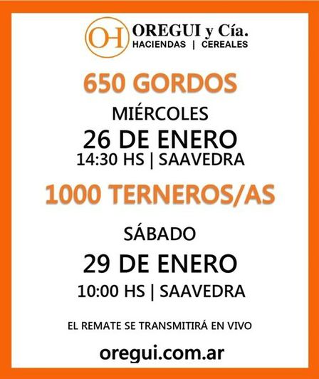 Las consultas, para esta subasta de animales, podrán efectuarse al 02923 49 71 67 o a través del sitio www.oregui.com.ar El remate, a realizarse el día jueves 27 de enero, contará con compradores solamente en las gradas, y será transmitido por internet.