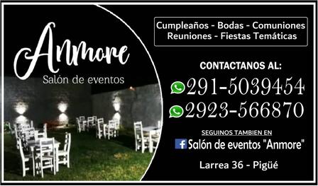 Es posible realizar consultas al 291 50 39 454 ó al 2923 56 68 70 o bien buscando, en Facebook, Salón de Eventos Anmore.