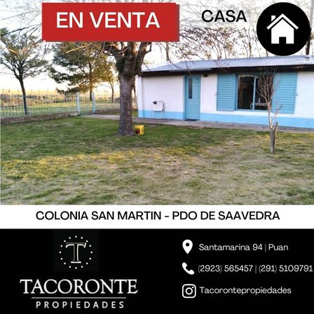 Tacoronte Propiedades recibe consultas en el portal www.tacorontepropiedades.com, al 2923 56 54 57 o en Santamarina 94 de Puan.