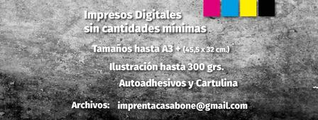 Imprenta Casabone trabaja en el diseño e impresión de calidad comprobada, imprime talonarios y papelería comercial y empresarial, lonas publicitarias, cartelería, ploteados en general, e impresiones digitales full color hasta tamaño A3 plus sin cantidades mínimas.