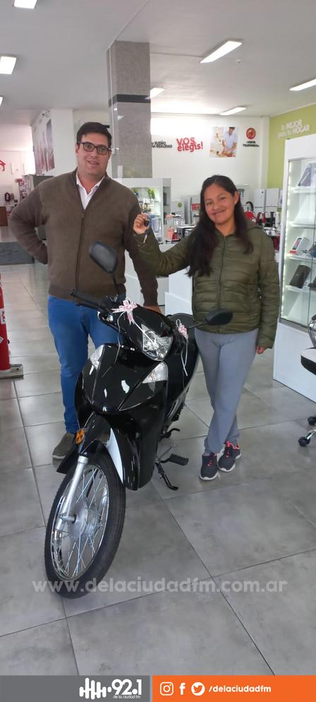 La entrega de la moto 110 centímetros cúbicos, a la ganadora, Elide Silvina Cachi, de Pigüé, fue realizada en Maipú esquina Avenida Casey de la ciudad.