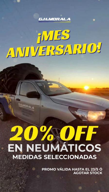 El local de Pigüé cumple 22 años presentando una promoción del 20 % de descuento en neumáticos seleccionados en rodado 14, 15 y 16, válida hasta el 23 de mayo, o hasta agotar stock.