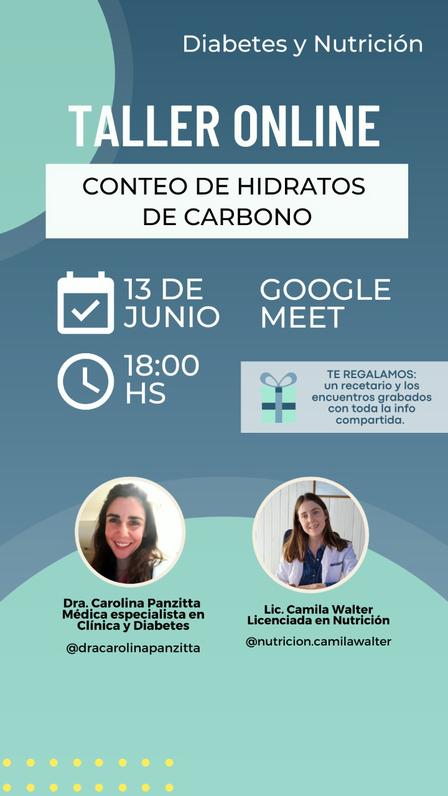 La Dra. Carolina Panzitta, Médica especialista en Clínica y Diabetes, junto a la Lic. Camila Walter, que es Lic. en Nutrición, estarán llevando a cabo un taller online, el 13 de junio, a las 18.00 horas, vía Google Met.
