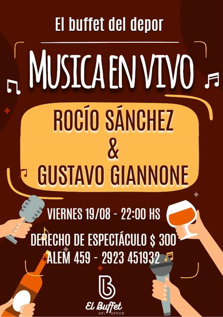 En el espacio gastronómico ubicado en la Sede Social del Club Deportivo Argentino, hoy, viernes, el show de Rocío Sánchez y Gustavo Giannone está anunciado para las 22.00 horas, con un derecho de espectáculo que costará 300 pesos.