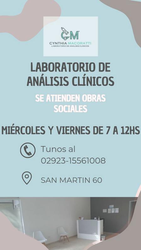 El laboratorio de análisis clínicos de la Lic. Cynthia Macorati atiende los días miércoles y viernes de 7.00 a 12.00 horas en calle San Martín 60 de la ciudad.