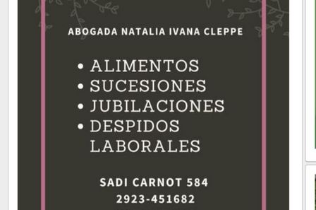 Las consultas, con Natalia Ivana Cleppe, pueden hacerse en su oficina de Sadi Carnot 584 de Pigüé, al 2923 45 16 82, acerca de demandas de amparos por mora ante el Instituto de Previsión Social, su especialización usucapión y sucesiones, despidos y alimentos.