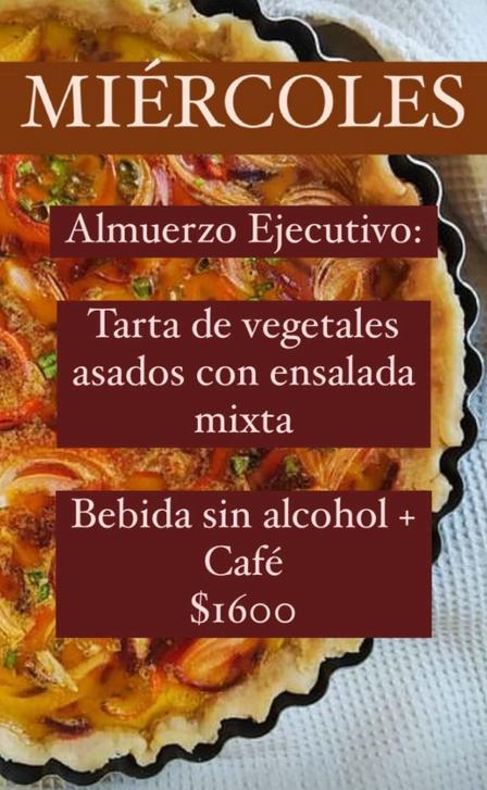 Tarta de vegetales asados con ensalada mixta, bebida sin alcohol, y café, pueden conseguirse a 1.600 pesos en el almuerzo ejecutivo de este miércoles.