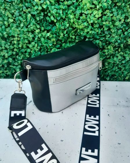 Es la nueva Bruna combinada en colores negro y plata, con brillo, en stock, tamaño XL, fabricada en PU eco cuero, forrada en gross, con un compartimiento principal amplio, un bolsillo delantero, ambos con cierre, correas regulables e intercambiables en cinta de poliéster sublimadas de 4 centímetros, con herrajes níquel, costando 6.500 pesos, siendo posible abonarse vía Cuenta DNI o por transferencia bancaria.