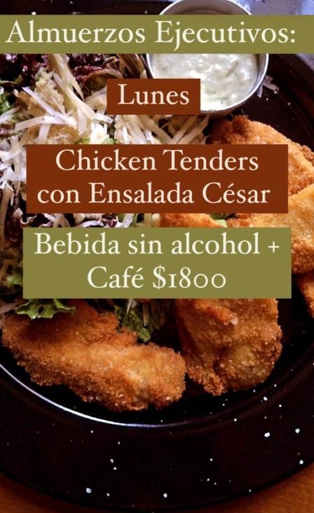 La propuesta gastronómica para el lunes es de chicken tenders con ensalada César bebida sin alcohol y café, por 1.800 pesos.