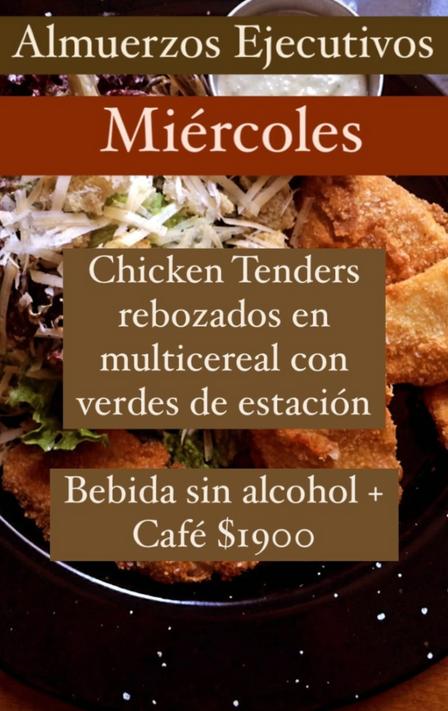 La propuesta gastronómica para el miércoles es chicken tenders rebozados en multicereal, con verdes de estación, bebida sin alcohol y café, por 1.900 pesos.