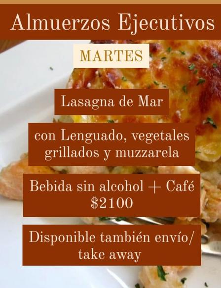 El menú de hoy es de lasagna de mar con lenguado, vegetales grillados y muzzarela, más bebida sin alcohol y café a 2.100 pesos.