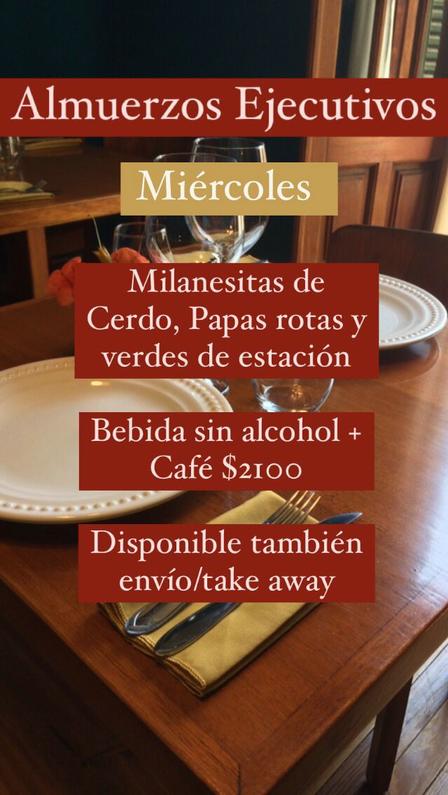El menú de hoy es de milanesitas de cerdo, papas rotas y verdes de estación, más bebida sin alcohol y café a 2.100 pesos.