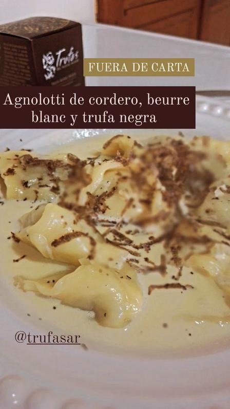 Fuego Sagrado Restaurant cocina, este fin de semana, fuera de carta, agnolotti de cordero, beurre blanc, y trufa negra.