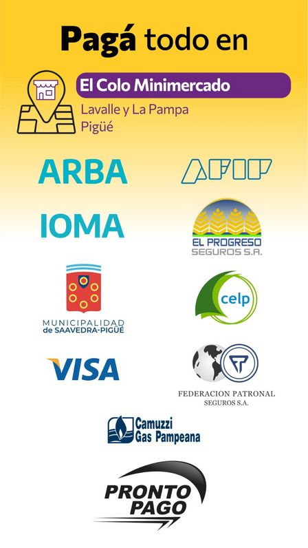 Camuzzi Gas Pampeana, Municipalidad de Saavedra - Pigüé, El Progreso Seguros, Cooperativa Eléctrica de Pigüé, IOMA, Visa, Federación Patronal Seguros, ARBA y AFIP son los servicios que pueden abonarse en El Colo Minimercado.