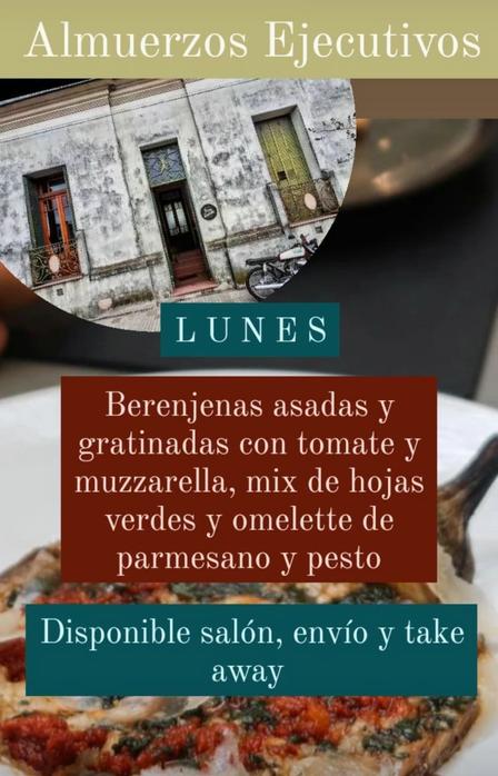 Fuego Sagrado Restaurant cocina berenjenas asadas y gratinadas con tomate y muzzarella, mix de hojas verdes, y omelette de parmesano y pesto.