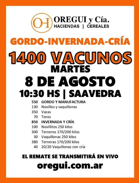 Las consultas, para esta subasta de animales, podrán efectuarse al 02923 49 71 67 o a través del sitio www.oregui.com.ar