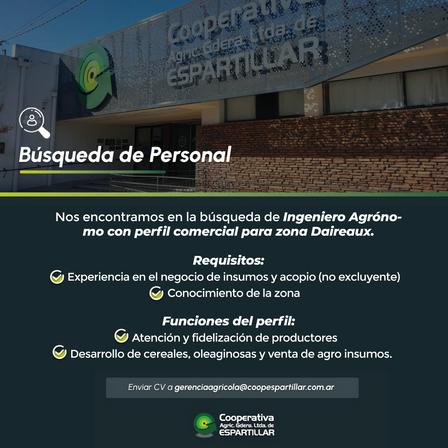 Se trata de una búsqueda de Ingeniero Agrónomo con perfil comercial para la zona de Daireaux. Los requisitos son tener experiencia en el negocio de insumos y acopio (no excluyente) y conocimiento de la zona.