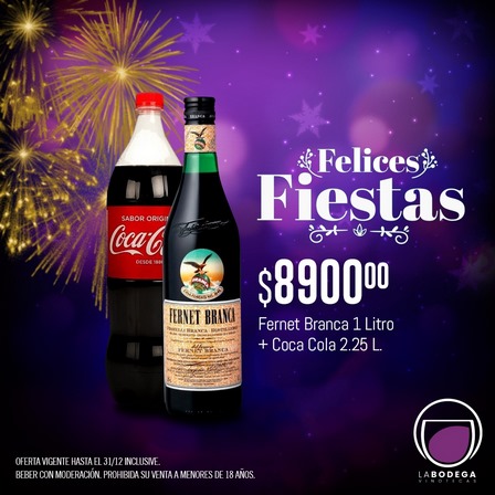 El Fernet Branca de litro más la Coca Cola de dos litros y un cuarto cuesta 8.900 pesos, la Cerveza Palermo de litro sale 890 pesos, el vino Santa Julia Dulce está a 3.500 pesos, y el Fresita a 3.200 pesos.