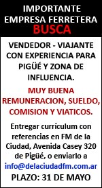 Según le indicaron a FM de la Ciudad los Currículum pueden ser entregados en Avenida Casey 320 de Pigüé o bien es posible enviarlos a Esta dirección de correo electrónico está siendo protegida contra los robots de spam. Necesita tener JavaScript habilitado para poder verlo..