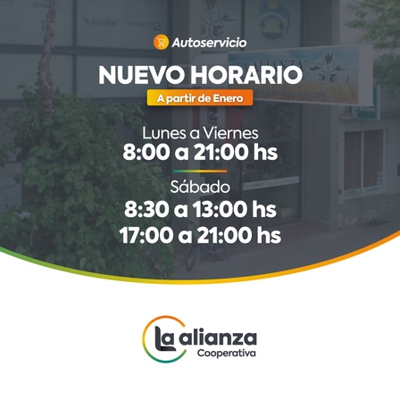 Los sábados el Autoservicio de Cooperativa La Alianza abre de 8.30 a 13.00 horas y desde las 17.00 hasta las 21.00 horas.