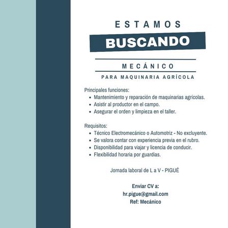 Buscan mecánicos para maquinarias agrícolas que cuenten con experiencia previa, disponibilidad para viajar, licencia de conducir y flexibilidad horaria por guardias.
