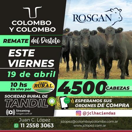 Mañana, viernes, en el Remate Rosgan Especial de Colombo y Colombo saldrán a venta 4.500 cabezas con plazos de 30 y 60 días, en vivo por Canal Rural a partir de las 10:00 horas.