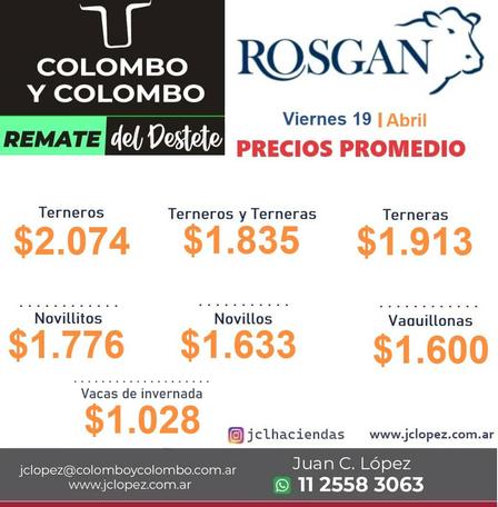 La Consignataria dio a conocer los precios promedio del Rosgan especial Colombo y Colombo, mientras que, confirma ya está filmando para el Remate Rosgan del 8 de Mayo que será transmitido, en vivo, por Canal Rural.