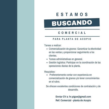 Buscan Comercial para Planta de Acopio que preferentemente cuente con experiencia en comercialización de granos y / o tener conocimientos en el rubro. Se ofrecen excelentes condiciones de contratación y de desarrollo.