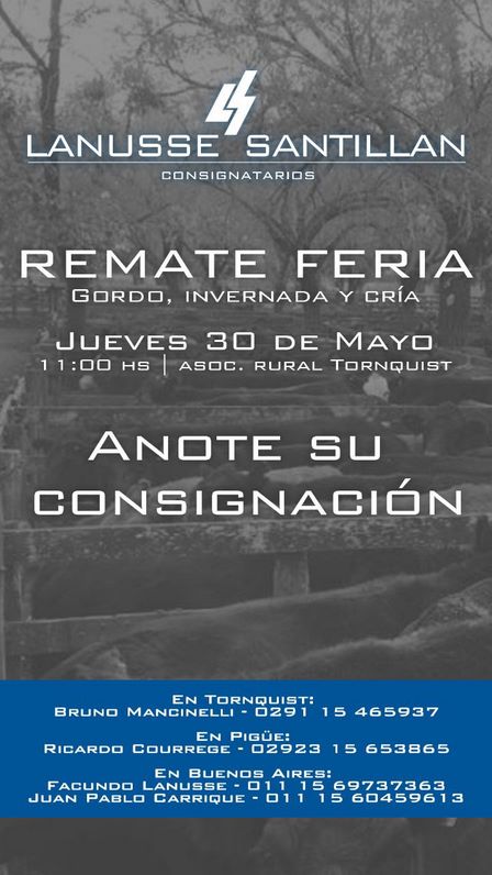 Las consultas, en Tornquist, pueden hacerse a través de Bruno Mancinelli, al 291 46 59 37, en Pigüé con Ricardo Courrege al 2923 65 38 65, y en Buenos Aires tanto con Facundo Lanusse al 11 69 73 73 63 como con Juan Pablo Carrique al 11 60 45 96 13.