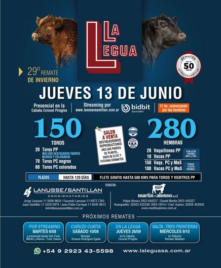 Para el día 13 de junio de 2024, jueves, desde las 11.00 horas, en Cabaña La Legua, del Partido de Coronel Pringles, saldrán a la venta 150 toros siendo 20 toros puros pedigree destacándose como padres negros y colorados, 70 toros puros controlados negros y 60 toros puros controlados colorados, más 280 hembras, siendo 20 vaquillonas puras pedigree y 10 vacas puras pedigree con garantía de preñez negras y coloradas, 150 vaquillonas puras controladas y MaS y 100 vacas puras controladas y MaS con garantía de preñez, contando con plazos de hasta 120 días, y flete gratis hasta 500 kilómetros para todos y vientres de puro pedigree.