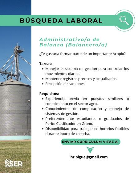 Buscan personal administrativo de balanza contando con la necesidad de presentar requisitos tales como experiencia previa, conocimientos de computación y de manejo de sistemas de gestión, con disponibilidad para trabajar en horarios flexibles durante la época de cosecha.