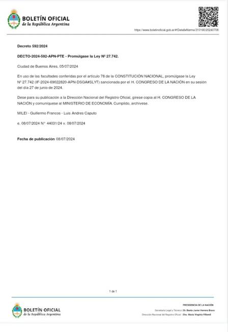 Como caracteriza la información brindada por el equipo de profesionales, a primera hora del día de hoy, se informó -con imagen del Decreto- que el Gobierno promulgó este lunes la Ley Bases y el paquete fiscal, leyes sancionadas por el Congreso luego de largas negociaciones.