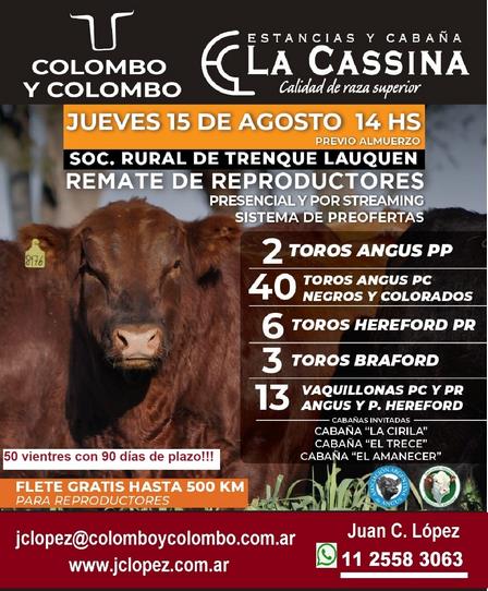 La Consignataria junto a Juan Carlos López anuncia el remate de La Cassina en Trenque Lauquen indicando que ya está abierto el sistema de pre ofertas, destacando la existencia de flete gratis para toros, contando con la subasta de vientres paridos y preñados con 90 y 180 días de plazo.