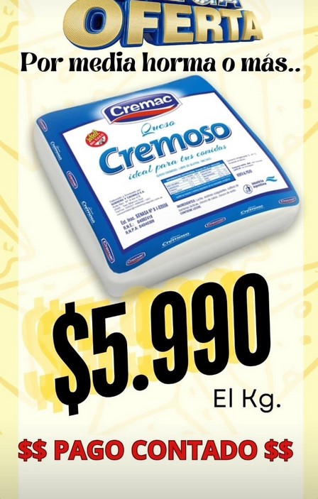 El kilo de queso cremoso Cremón, comprando por horma, cuesta 7.900 pesos pagando contado, mientras que, el kilo de queso Cremac, por media horma o más, sale 5.990 pesos abonando de contado.