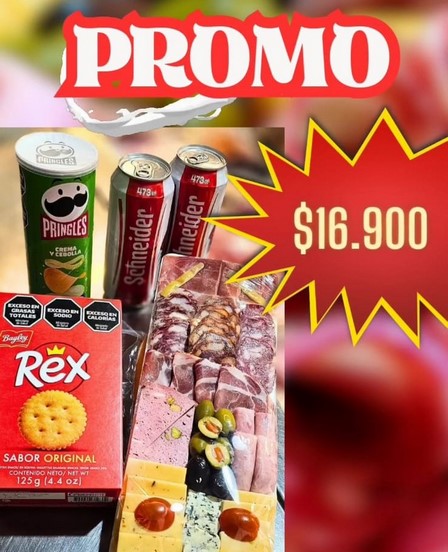 Una tabla de picadas, las galletitas Rex, dos latas de cerveza Schneider de 473 cc., y una lata de papas fritas Pringles, cuestan 16.900 pesos.