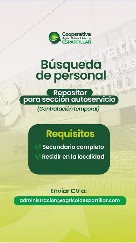 La Cooperativa Agrícola Ganadera Limitada de Espartillar busca repositor