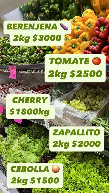 Los 2 kilos de cebollas salen 1.500 pesos, los dos kilos de zapallitos están a 2.000 pesos, el kilo de cherrys cuesta 1.800 pesos, los 2 kilos de tomate están a 2.500 pesos, los 3 choclos por 1.500 pesos, y los 2 kilos de berenjenas a 3.000 pesos.